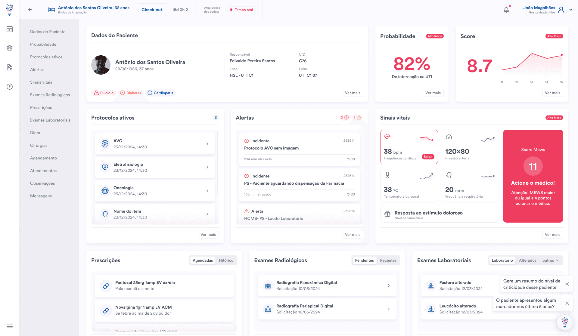 Algoritmos de IA que calculam diferentes probabilidades de condições clínicas do paciente, tudo em tempo real